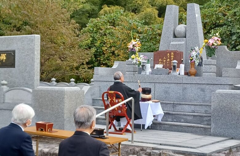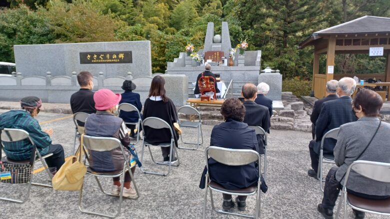 11月5日(土)、秋らしい青空に恵まれ、「ささぐりの郷」墓所前にて開催することができました。コロナの感染が収まりきれていないため、ご案内の通り、役員と納骨者のみの参加でした。